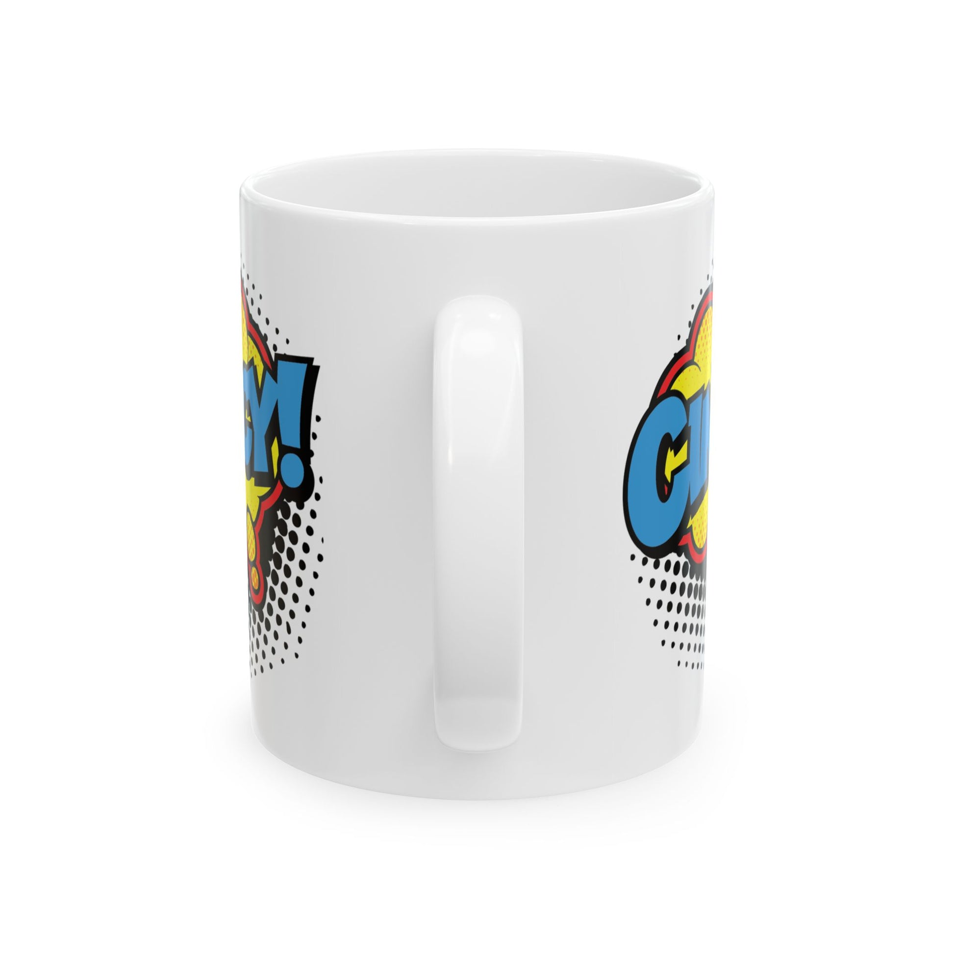 Bright, bold, and brimming with comic-book energy — this ceramic mug turns your morning coffee into a small celebration. The glossy white surface makes the pop-art design sing: saturated blues, reds, and yellows framed by classic halftone dots. It feels lively in your hands, from the comfortable C-handle to the smooth, shiny finish. Durable ceramic and vibrant printing mean the graphic stays crisp sip after sip. Heat and clean with confidence — microwave- and dishwasher-safe, and free from lead and BPA. Choose 11oz for a short, strong cup or 15oz when you want an extra pour of your favorite brew.
