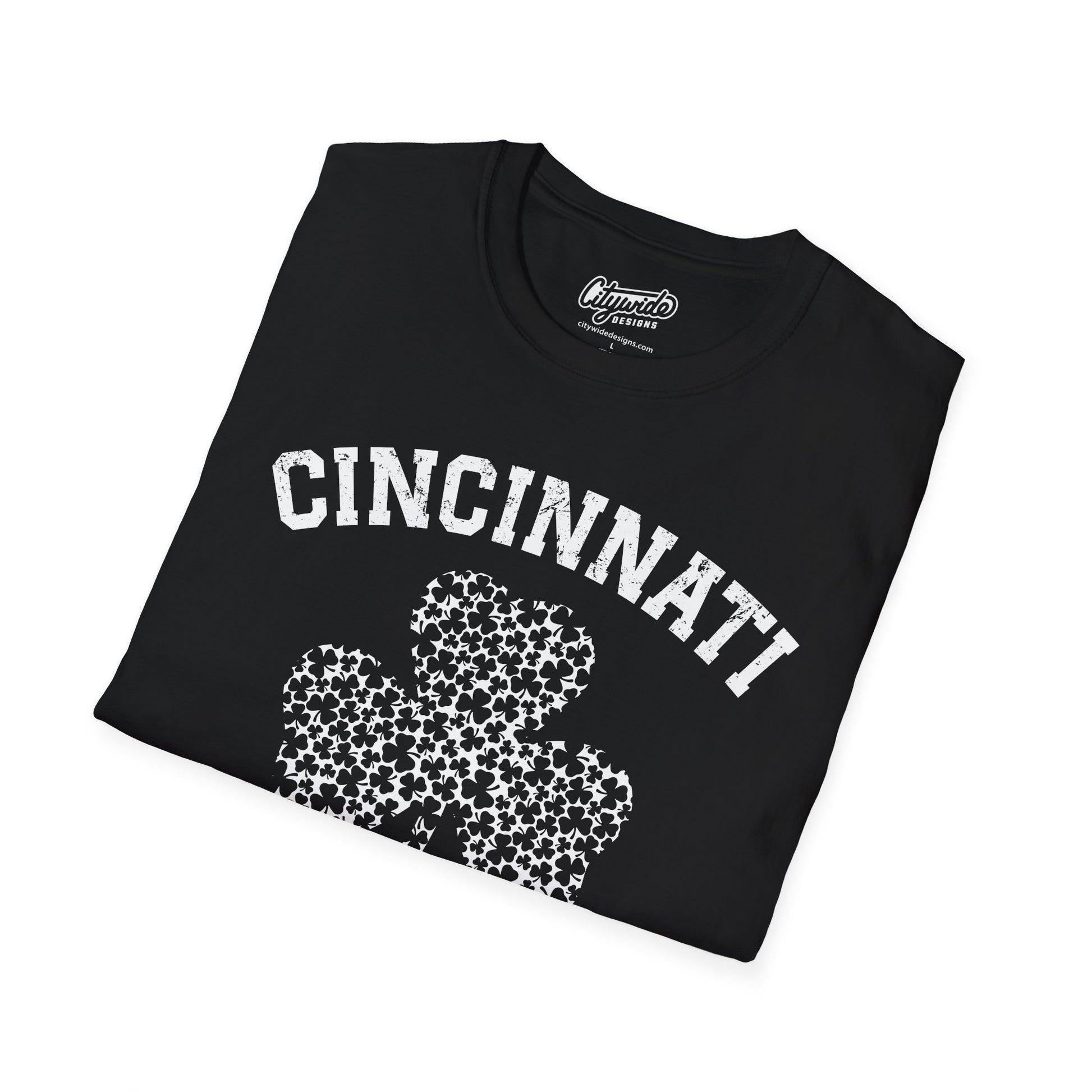 Featuring a grunge design with Cincinnati and one big shamrock made of mini shamrocks in white text printed on the fan-favorite Gildan 64000, this shirt blends soft, lightweight comfort with a modern, flattering fit. It’s your go-to tee for casual outings, game days, festivals, weekend errands, and everyday style.